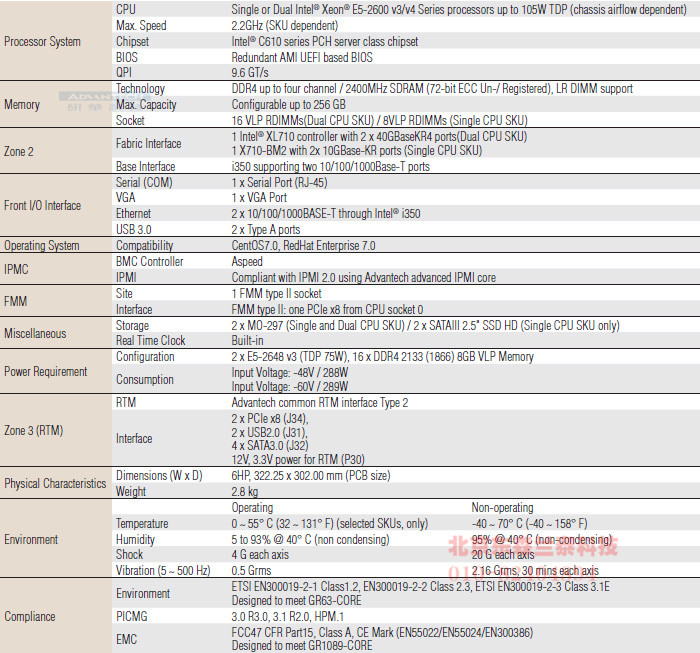 Advantech’s MIC-5345 is a 40G dual processor ATCA blade based on the Intel® server platform formerly codenamed "Grantley". MIC-5345 is offered in two main configurations: As a dual processor blade supporting 16 DDR4 VLP DIMM slots it offers best in class memory support at lowest cost making it an ideal choice for typical server workloads and virtualized application scenarios such as NFV. Up to 512GB memory capacity allow users to harness the full capabilities of Intel®’s E5-2600v3 series processors with up to 24 cores and 48 threads for virtualization by providing an high amount of physical memory per virtual machine.
