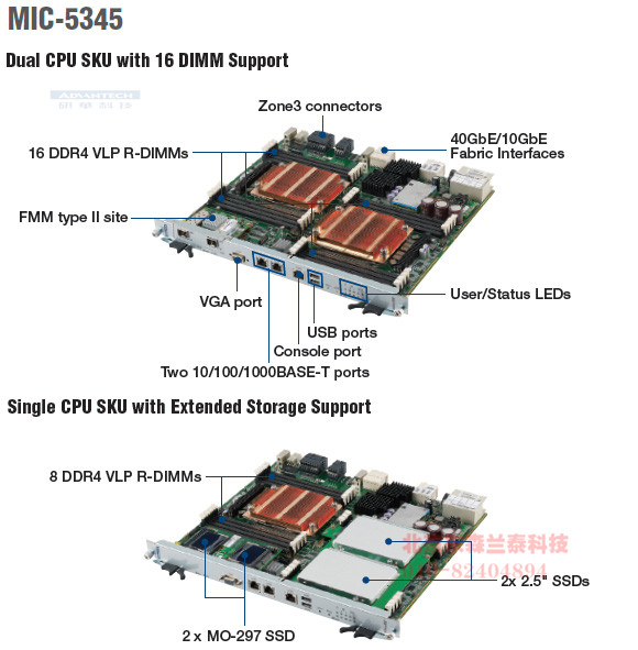 | MIC-5345SD2-P2E | MIC-5345 dual cpu sku, fur 40GBASE-KR4 FI ports with two twelve-cores E5-2648Lv4 CPUs, no memory, no MO-297/SSD |