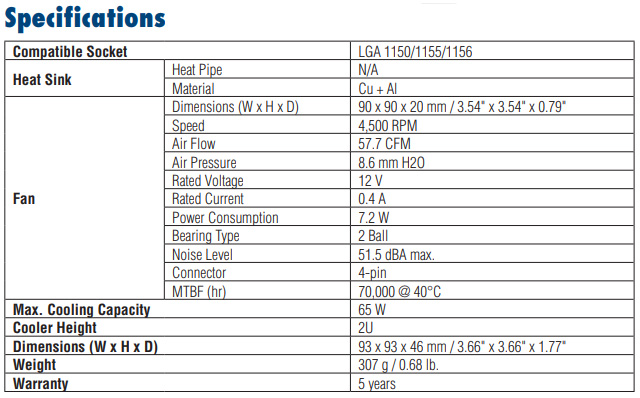 Active 2U 65W CPU Cooler for Intel® Socket H (LGA1150/1155/1156)
