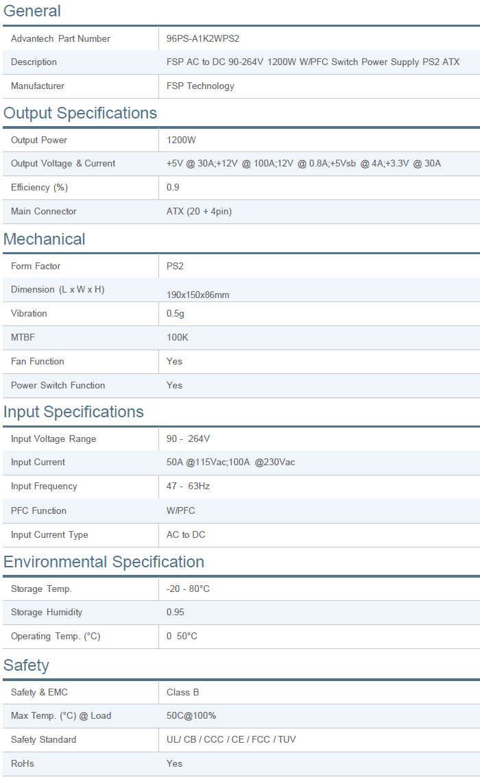 96PS-A1K2WPS2 FSP AC to DC 90-264V 1200W PS2 Switch Power Supply with PFC