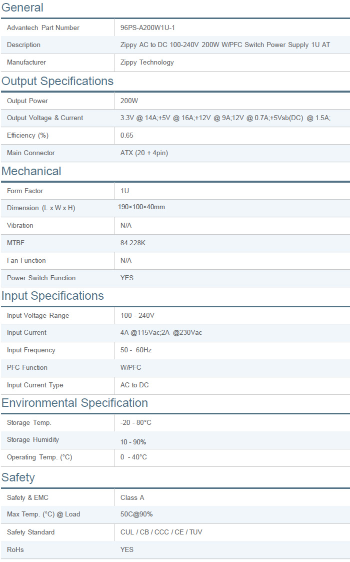 Zippy AC to DC 100-240V 200W1U Single Switch Power Supply with PFC |
