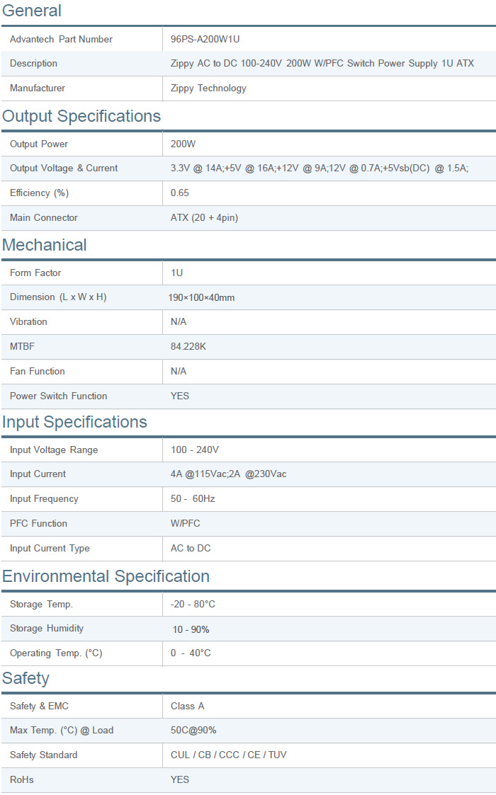 96PS-A200W1U Zippy AC to DC 100-240V 200W 1U Single Switch Power Supply with PFC