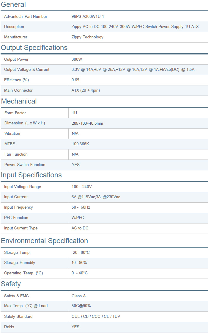 Zippy AC to DC 100-240V 300W 1U Single Switch Power Supply with PFC |