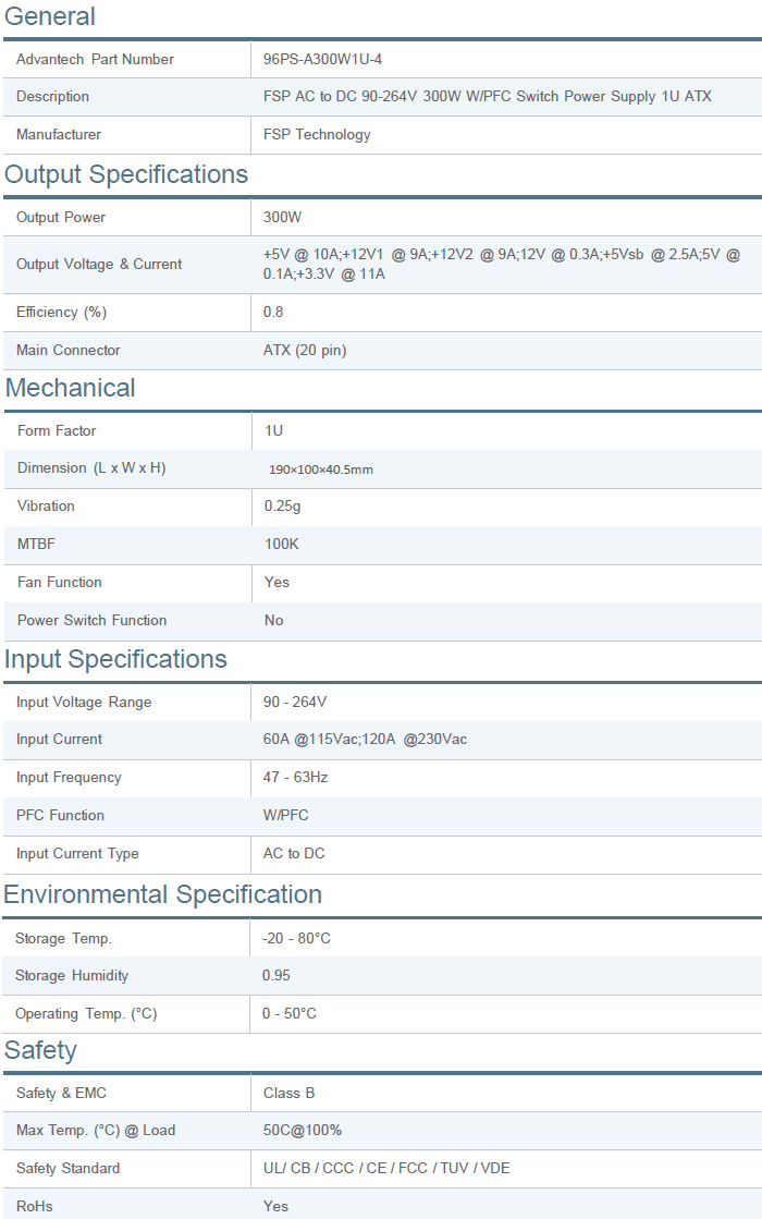 96PS-A300W1U-4 FSP AC to DC 90-264V 300W 1U Single Switch Power Supply with PFC