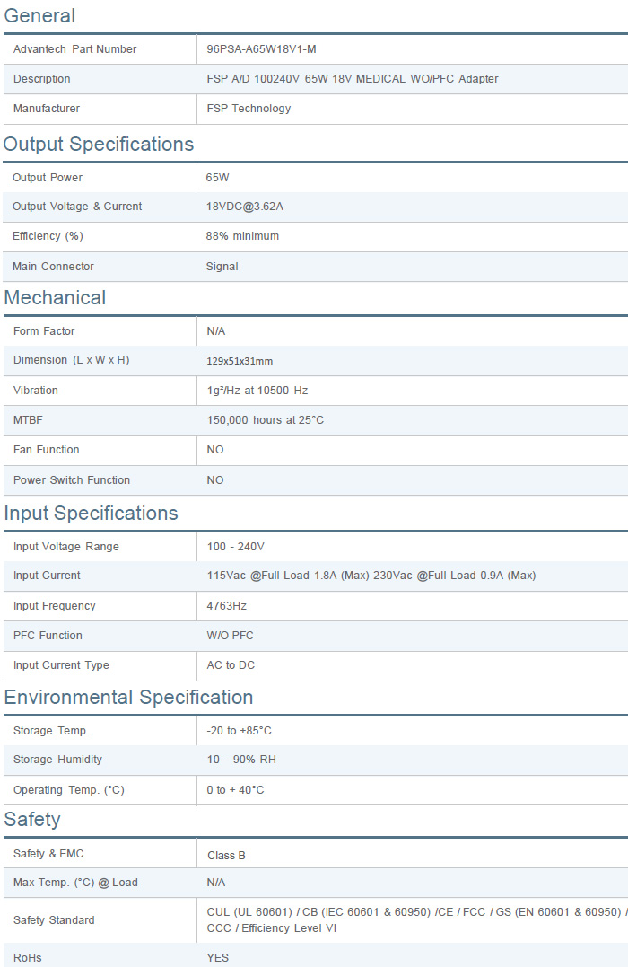 FSP Adapter AC to DC 100-240V 65W 18V C6 DC PLUG 180° (Medical use) |