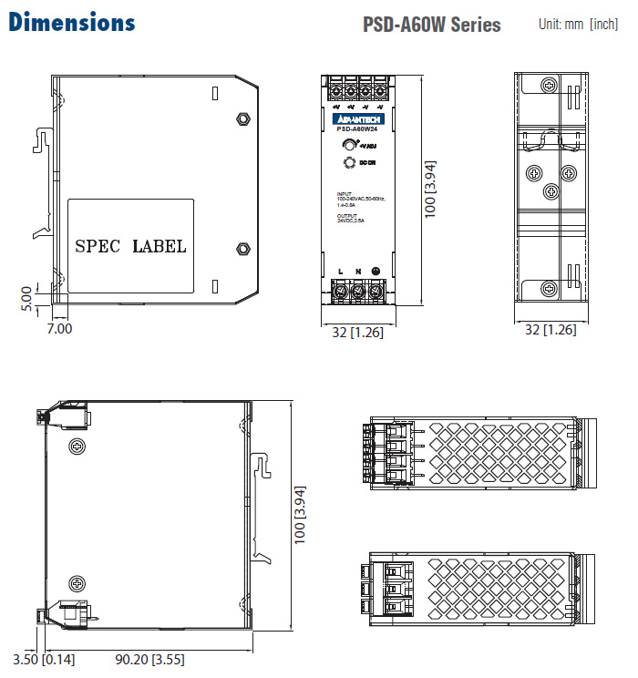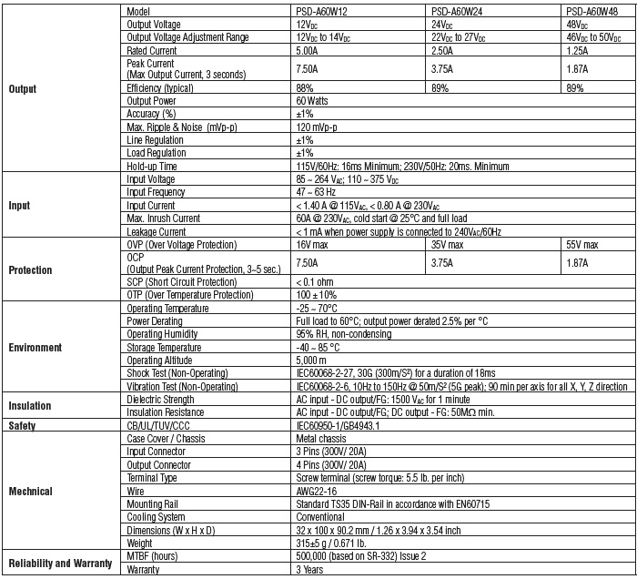| PSD-A60W12 | 12 VDC/ 60 Watts DIN-Rail Power Supply |