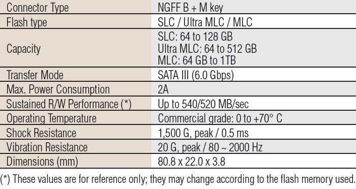 SQF-SM8M8-xx-SAC SQFlash 830 series M.2 2280 SATA SSD 64/128/256/512 GB /1TB MLC (0 ~ 70° C)