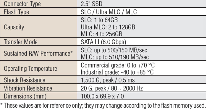 SQF-S25U4-XG-S9E  SQFlash 630 series 2.5” SSD, UltraMLC, 8/16/32/64/128 GB (-40 ~ 85 °C)