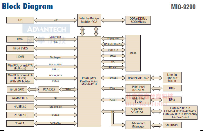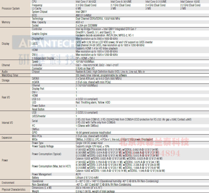 Intel® 第三代core i3/i5/i7系列Mobile Socket 处理器 + Intel QM77 PCH, 1 x DDR3/DDR3L SO-DIMM 最高可达8GB