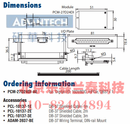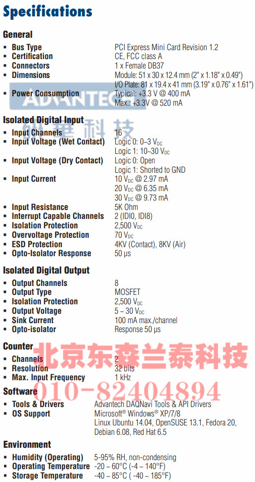 24通道隔离数字量 I/O 带计数器 mPCIe, DB37 |