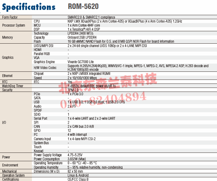 基于NXP i.MX8X SMARC2.0 Arm核心模块,多接口,低功耗设计,研华 ROM-5620 SMARC 2.0核心板采用NXP i.MX 8X 处理器,支持2/4* Arm Cortex-A35及1*Cortex-M4实时运算内核,Vivante GC7000图形引擎支持4K H.265硬解码及独立双显1080P@60Ghz。具备丰富外设接口:1 USB3.0, 2 USB2.0,双千兆网口,1 PCIe3.0x1,2x CAN 等。