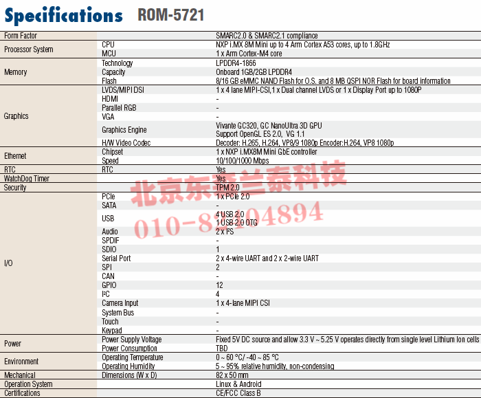 ROM-5721CQ-REA1E i.MX8M Mini Quad 2GB 1 x Dual ch LVDS 3 ~ 5.25V 0 ~ 60 °C