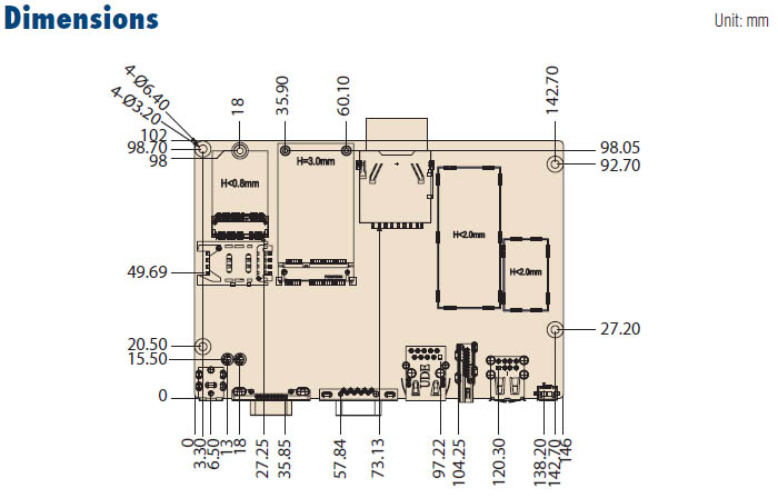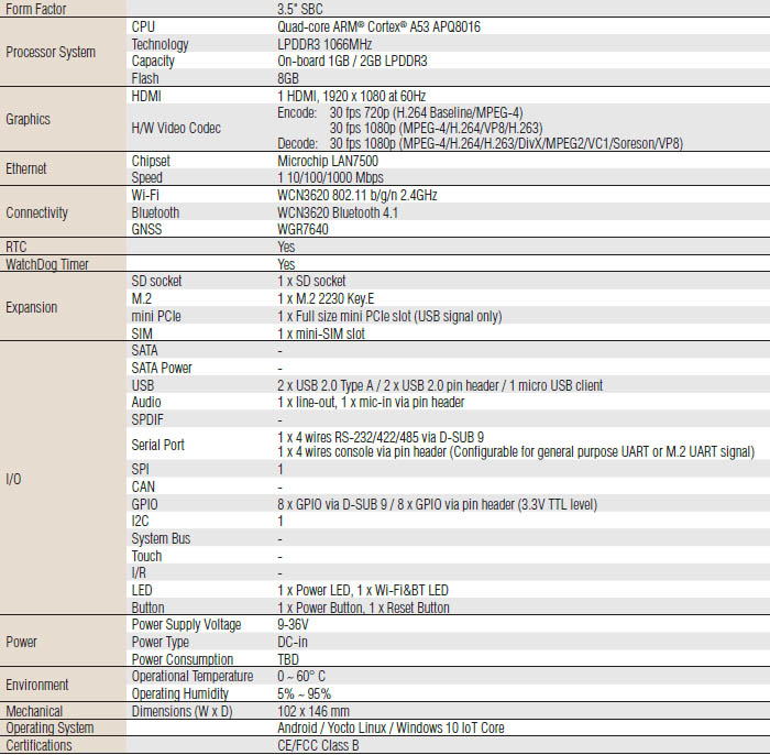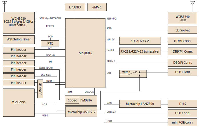 Onboard 1GB/2GB LPDDR3 memory and 8GB eMMC