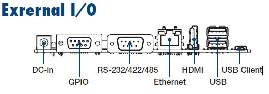 1 HDMI, 1 RS-232/422/485, 1 GbE, 4 USB 2.0, 16 GPIO, 1 I2C, 1 SPI