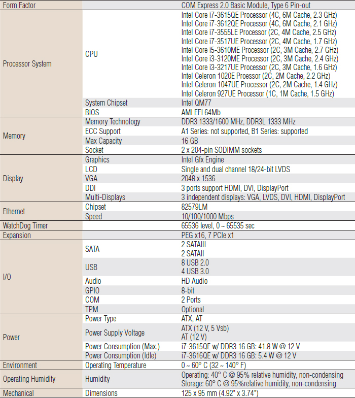 | SOM-5892FG-U/A1E | Core™ i5-3610ME 2.7 GHz | 0 ~60° C |