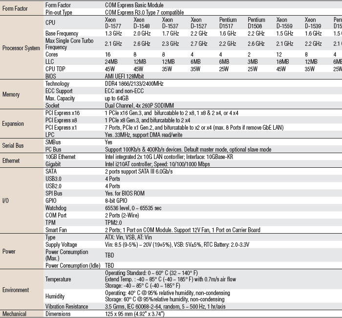 COM-Express Basic 是新推出的嵌入式计算机模块,外型尺寸为 125 mm x 95 mm,支持 Intel Core i、Intel Atom 及 Intel 第四代处理器。 COM-Express Basic 在载板上采用多种全新的高速接口,例如 PCIe 绘图卡、PCIe、PCI、SATA 及 SDVO。 研华的 COM-Express Basic 广泛支持各种处理器 (包括 Intel Core i、Intel Atom 及 Intel 第四代),为应用程序工程师提供强大的 CPU.Intel Xeon 处理器 D-1500 COM Express R3.0 Type 7 模块
