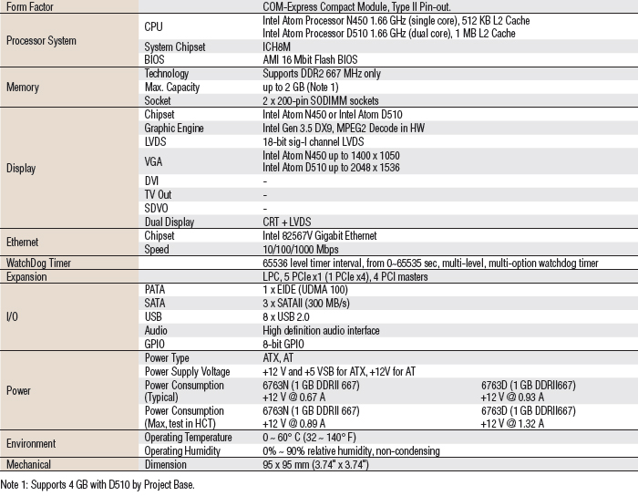 Embedded Intel® Atom™ Processor N450 SC 1.66 GHz / D510 DC 1.66 GHz + ICH8M