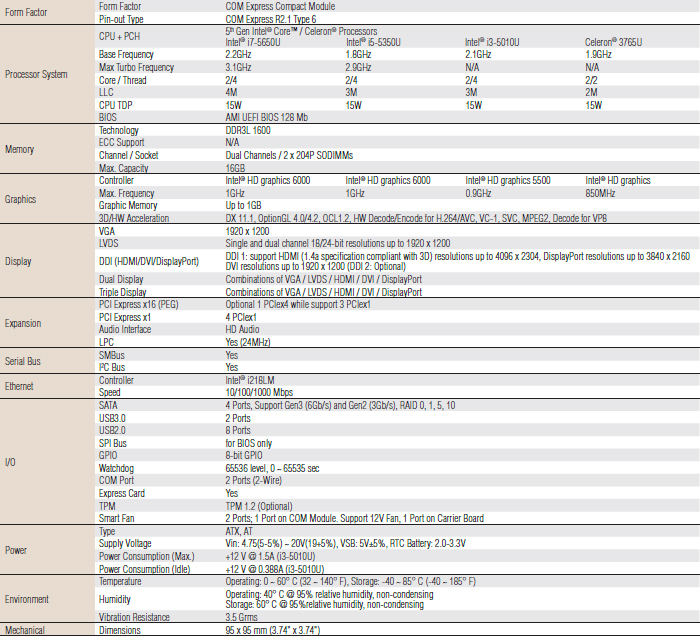 | SOM-6896C3-U1A1E | Intel i3-5010U | 0 ~ 60° C |