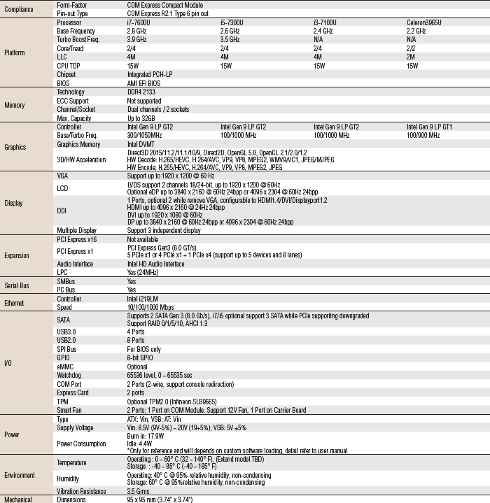 研华COM-Express Compact 是其中一款 COM-Micro 精简型系列产品,该系列产品皆采用低功耗处理器设计。 这些产品与 COM-Express Compact Type 2 标准款一样,具有相同的功能和针脚定义,然而机板尺寸较小,只有 95 x 95 mm,是低功耗行动应用的最佳解决方案。第七代Intel Core/Celeron处理器 COM Express Compact模块Type 6