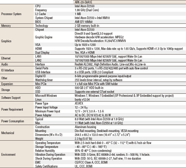 ARK-20-S8A1E Intel Atom D2550 1.86 GHz