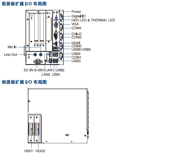 支持 2 GbE, 3 USB 3.0, 3 USB 2.0, 1 DIO, 音频和 4 个 COM 口
