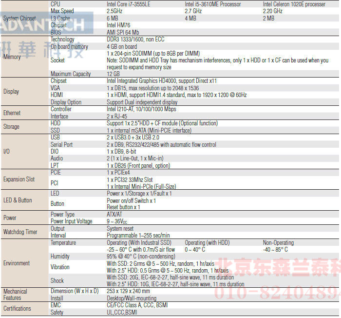 | ARK-5420-U7A1E | I5-3610ME, VGA+HDMI PCIE*4, PCI, Mini-PCIE (三扩展) |