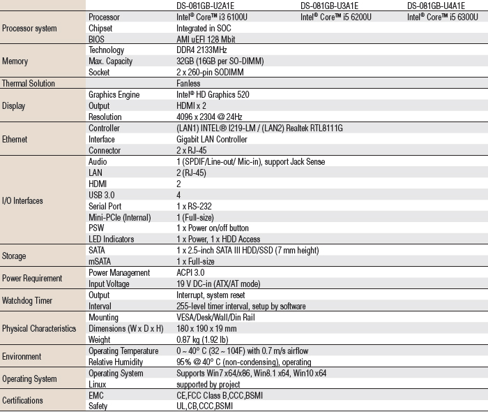 DS-081GB-U3A1E DS-081, Intel® Core™ i5 6200U, barebone