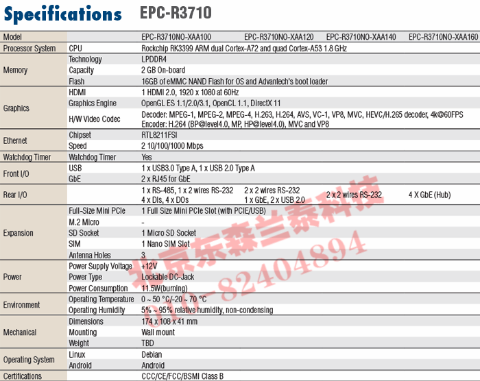 | EPC-R3710NO-XAA100 | Rockchip RK3399 | 2 GB | 16 GB | 0 ~ 50 °C |