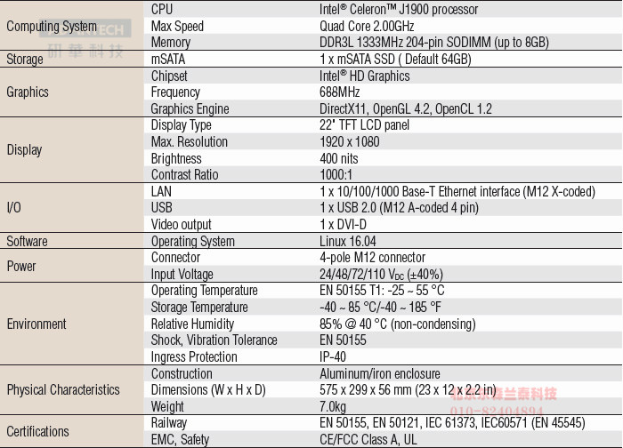 EN 50155 Intel® Celeron™ J1900 22" Fanless Railway Panel PC