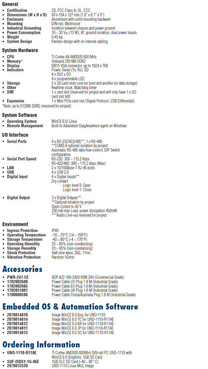 | UNO-1110-R11AE | TI Cortex AM3505 600MHz DIN-rail PC UNO-1110 with WinCE 6.0 (English), 1GB SD Card |