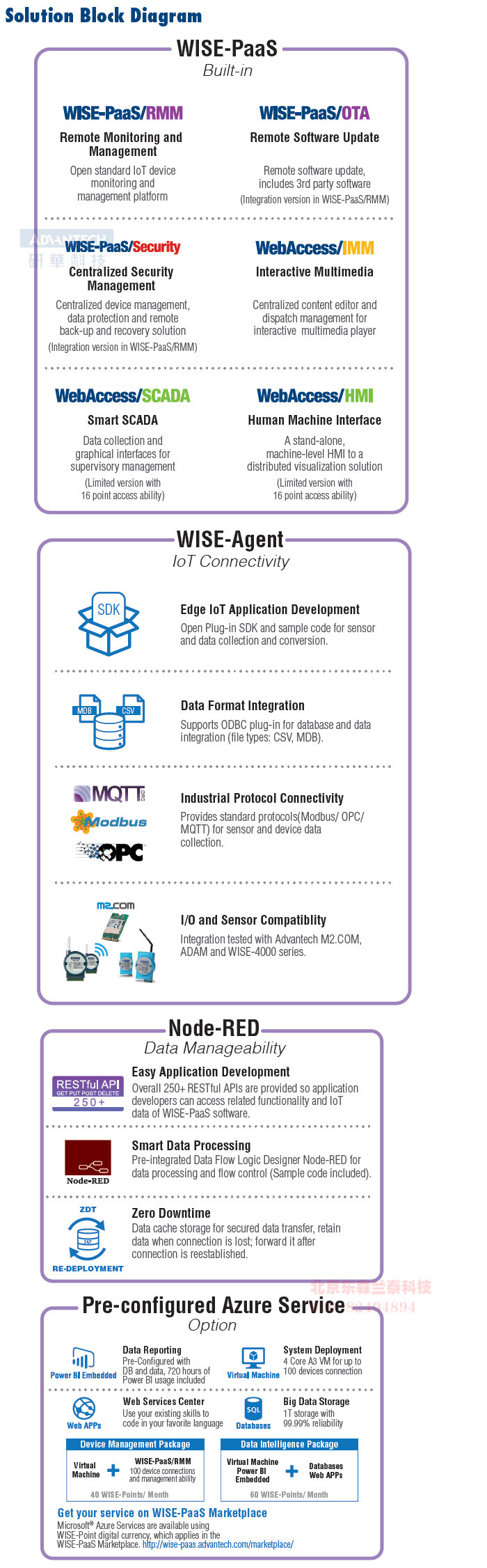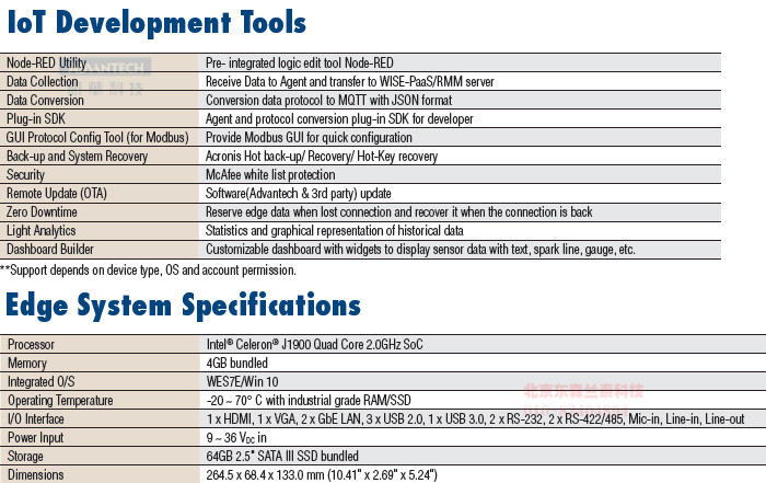 Pre-integrated WISE-PaaS Software Package: WISE-PaaS/RMM, WISEPaaS/OTA, WISE-PaaS/Security, WebAccess/SCADA, ebAccess/IMM and WebAccess/HMI