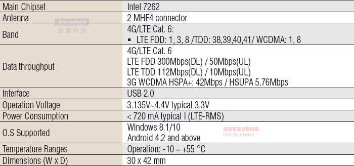Advantech provides a highly integrated 4G wireless communication module which adopts the standard PCIe M.2 interface, it supports 4G LTE Cat6 TDD/FDD/WCDMA systems. The down link speed will reach 300Mbps and double performance compared with the Cat4 solutions.