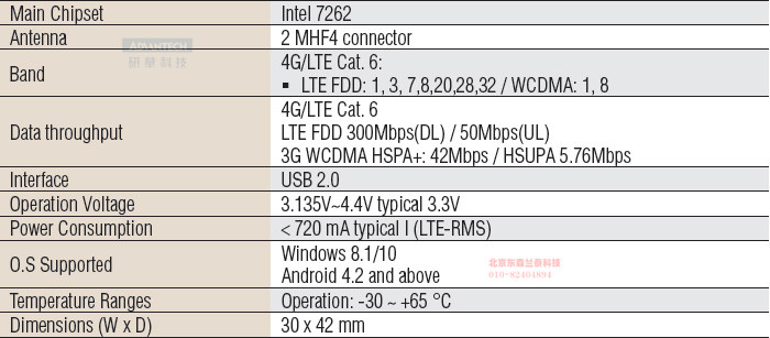 Advantech provides a highly integrated 4G wireless communication module which adopts the standard PCIe M.2 interface, it supports 4G LTE Cat6 FDD/WCDMA systems. The down link speed will reach 300Mbps and double performance compared with the Cat4 solutions