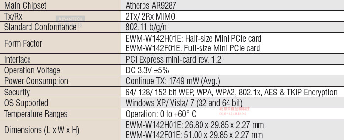 802.11 b/g/n, Atheros AR9287, Half-size Mini PCIe Card |