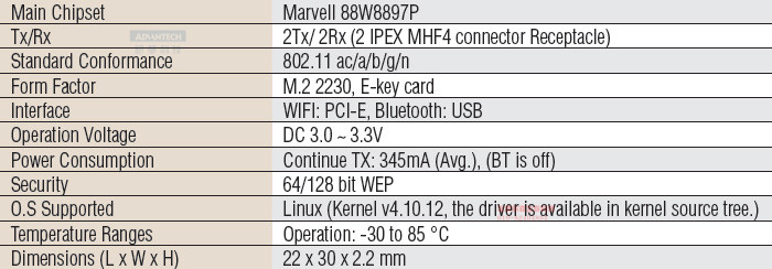 Advantech Brand, 802.11 ac/a/b/g/n, Marvell 88W8897P, 2T2R, w/ BT4.2 (Low energy operation) |