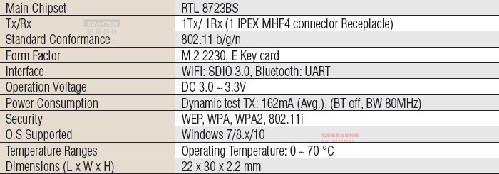 Advantech Brand, 802.11 b/g/n, RTL 8723BS, 1T1R, w/ BT4.0 |