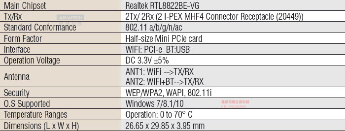 802.11 a/b/g/n/ac, Realtek RTL8822BE-VG, WiFi 2T2R, BT4.2, Half-size Mini PCIe Card |