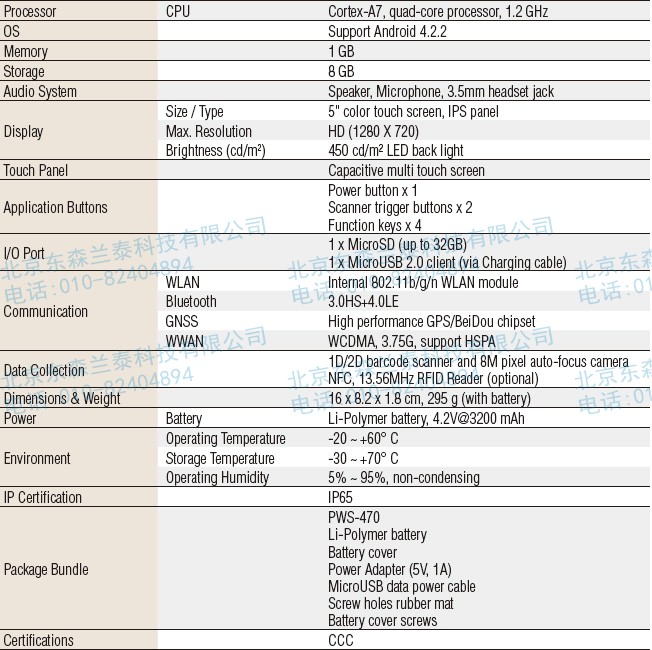 | PWS-470-C20E | PDA/HANDHELD, 5" ANDROID PAD QUAD-CORE 1.2GHZ/1G RAM W/O 2D |