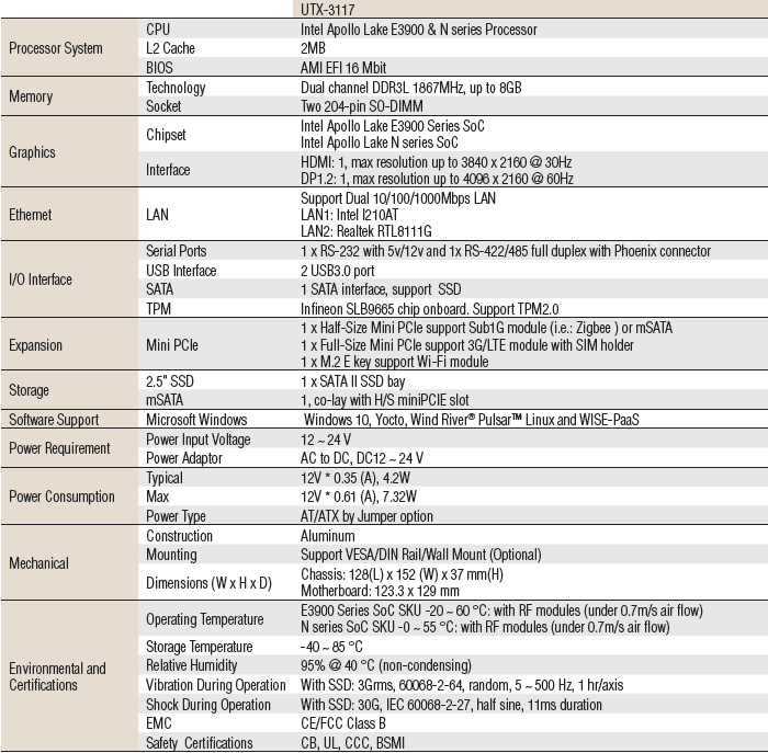 UTX-3117FS-S6A2E 1 Atom X5-E3940 4C 2M 1.6GHz