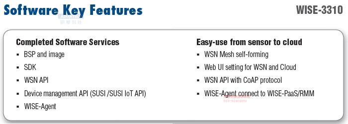 Advantech RISC-based WPAN Network Controller, WISE-3310, is powered by the Freescale i.MX6 Dual Cortex-A9 1.0 GHz processor, Linux 3.10.17 BSP and Linear Dust LTC5800 Cortex M3 MCU with Smartmesh core technology for IEEE 802.15.4e standards. With changeable embedded modules and feature-rich protocol, WISE-3310 creates a cost-effective open platform for easy integration and development in different M2M/IoT applications. Also, it is integrated with WISE-PaaS/RMM for IoT Software platform to complete and streamline the IoT solution, from sensor to cloud.