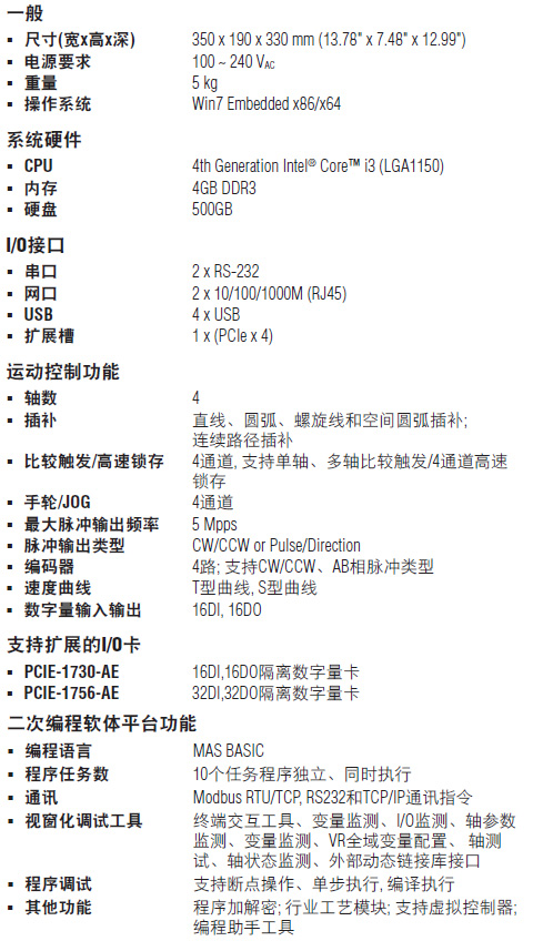 MAS-5242-EG是一款嵌入式PC-BASE运动控制器,该运动控制器基于研华快速二次开发软件平台Motion Studio,内建丰富的视窗化工具,采用多任务Basic编程语言,适用于多种场合下的应用,大幅缩短设备开发周期。控制器采用研华Softmotion核心,集成了高性能的DSP和FPGA,可以容易地计算运动轨迹,同步实时做运动控制以及IO处理,支持的功能如直线、圆弧、螺旋线、空间圆弧插补、多轴比较触发、高速位置锁存、T/S加减速曲线等。此外,研华提供的二次开发软件平台,可轻松完成系统配置和诊断,使用户通过简单快速操作就可以实现复杂的运动控制功能。