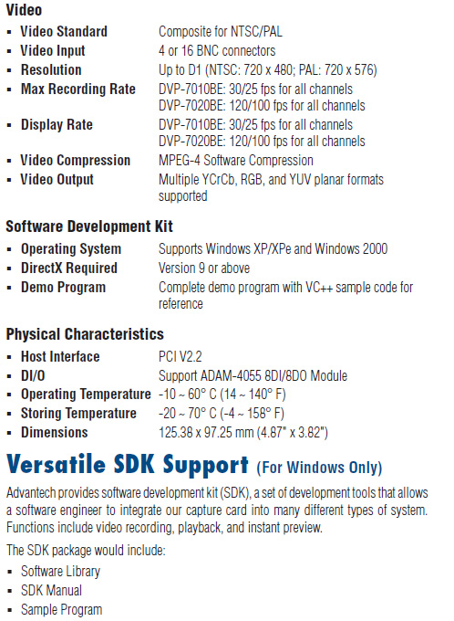 DVP-7020BE 是 16 通道输入的 PCI 总线视频捕捉卡。通过共享帧技术最多可支持 16 通道输入,并且在每秒 120/100 帧的速度下可捕捉最高至 D1 的分辨率。DVP-7020BE 支持通过 BNC 接头的 NTSC/PAL 复合视频输入,并且可通过 PCI 总线将数据数字化至 PC。可将 DVP-7020BE 用于视频捕捉或视频监视应用,此外它还带有支持软件编码和捕捉功能的 SDK。