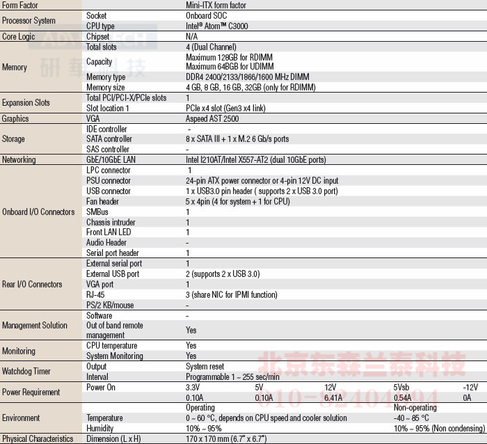 Intel® Atom™ C3000 Mini-ITX Server Board with 4 DDR4 DIMM, one PCIe x4 Slot (Gen 3.0), 8 SATA III, IPMI