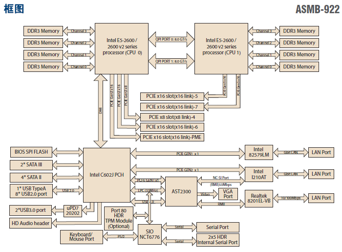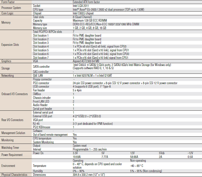 双LGA2011 Intel®Xeon E5-2600(v2)EATX 服务器板卡,支持DDR3,3PCIe x16 1 PCIex8(Gen 3.0),PME 支持