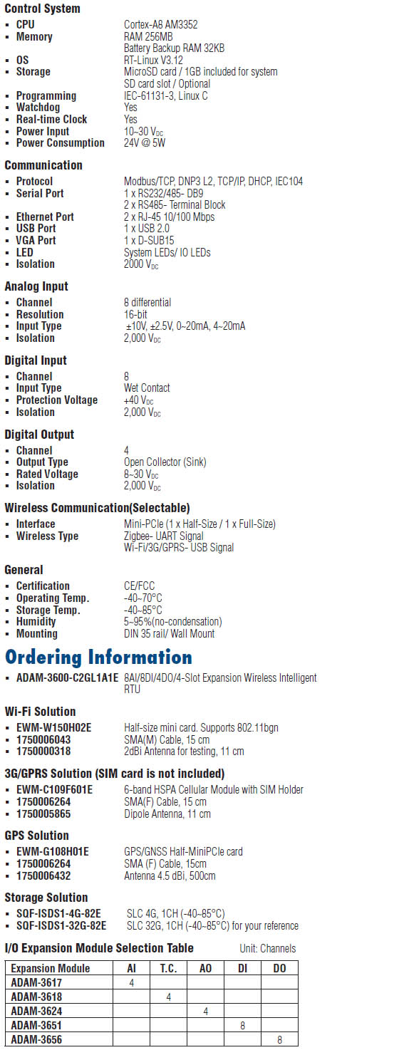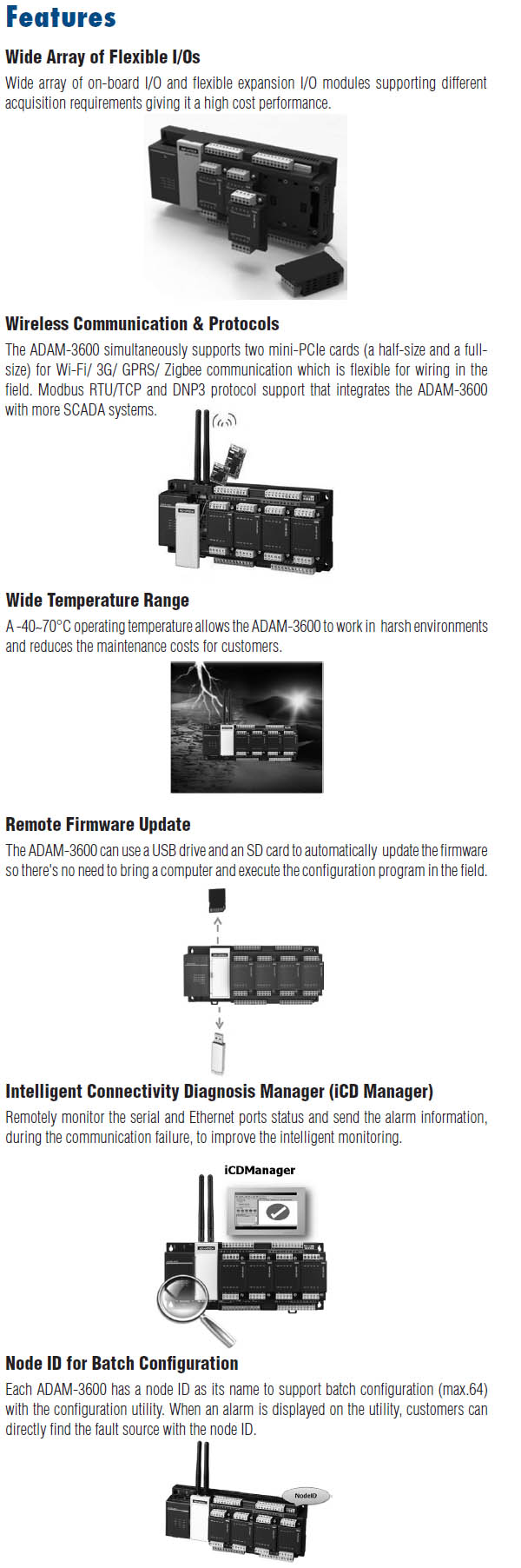 8AI / 8DI / 4DO / 4槽无线智能终端RTU,The ADAM-3600-C2G is an intelligent Remote Terminal Unit with multiple wireless function capability, multiple I/O selection, wide temperature range and support flexible communication protocol for oil, Gas and Water application. In the oil, gas and water application environments the ADAM-3600 is ideal for any other remote inhospitable regions with many devices to be managed remotely.