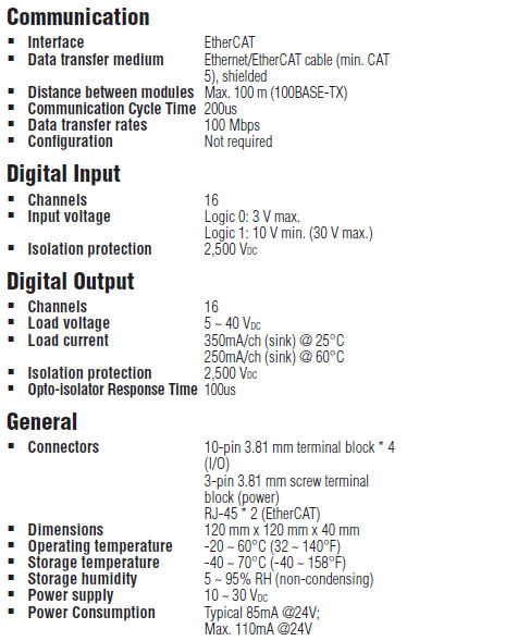 16-ch isolated digital input and 16-ch isolated digital output EtherCAT remote I/O module |