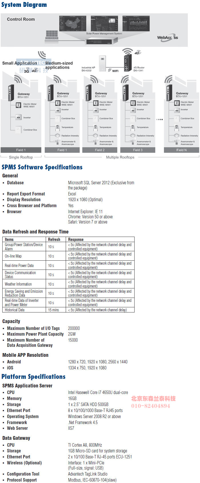 10 x ECU-1251 with Advantech TagLink, 1 x ECU-4784 with Intel Hasewell Core i7 1.7GHz, 16GB RAM, 500GB SATA HDD, Windows Server 2008 R2, WebAccess Pro. Unlimited tags, SPMS with one APP client license
