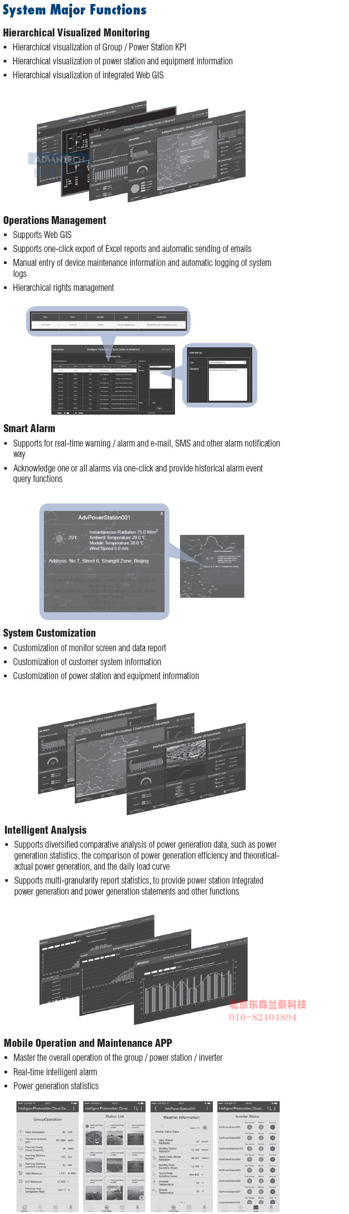 iFactory系列整合应用解决方案专注于与智能制造/工业4.0技术紧密结合的高度自动化行业市场,如汽车装配、食品饮料和家用电子工业等。AdSolar power management system (SPMS) aims to improve the efficiency of power generation and reduce the cost of operation and maintenance. It optimizes the power station in an intelligent way to effectively enhance power generation. The system integrates hardware and software into one, and adopts an acquisition gateway which supports multi-protocols and multi-network communication to realize the accurate acquisition of power station data. With the help of high-performance application server for electrical use only, SPMS, the WebAccess Dashboard based system can perform remote visual management and mass data analysis of the power stations. Moreover, this system has also integrated various monitoring data and build a unified maintenance platform, making it ideal for different solar power stations where the operational staff can realize many intelligent monitoring and management tasks, such as daily operations, upper system monitoring and station management, etc.
