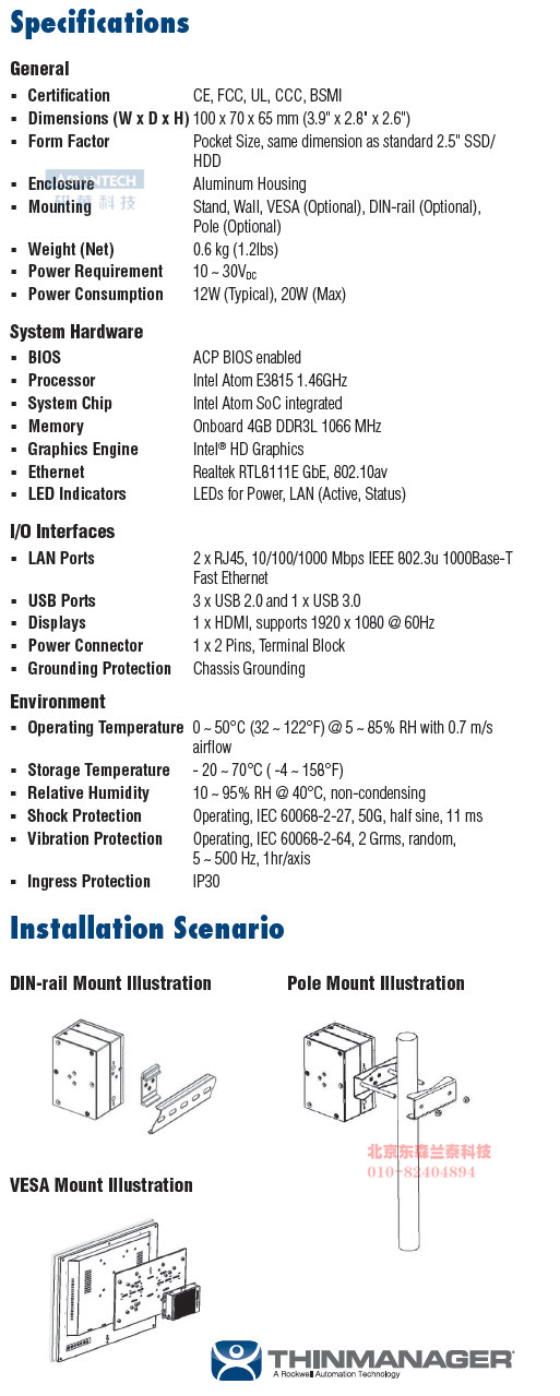 Pocket size Industrial ACP Ready ThinClient, 1 x HDMI, 4 x USB.iFactory系列整合应用解决方案专注于与智能制造/工业4.0技术紧密结合的高度自动化行业市场,如汽车装配、食品饮料和家用电子工业等。Realize the true value of thin client and centralized management technologies with Advantech’s ThinManager Compatible industrial thin clients. ACP’s ThinManager, the leading thin client solution for the factory floor, and Advantech’s industrially hardened thin client hardware provide a unique solutions for centralized management of factory floor applications. The SRP-FPV240-01 is the perfect ThinManager pocket-size industrial thin client for applications where flexibility and cost savings of client is desired. The SRP-FPV240-01 also supports full HD HDMI port and up to 4 USB ports.