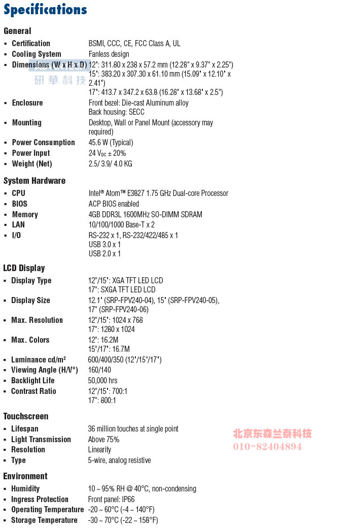 12.1" TFT LED LCD Industrial Touch Panel ACP Ready ThinClient.iFactory系列整合应用解决方案专注于与智能制造/工业4.0技术紧密结合的高度自动化行业市场,如汽车装配、食品饮料和家用电子工业等。 Realize the true value of thin client and centralized management technologies with Advantech’s ThinManager Compatible industrial thin clients. ACP’s ThinManager, the leading thinclient solution for the factory floor, and Advantech’s industrially hardened thin client hardware provide a unique solutions for centralized management of factory floor applications. The SRP-FPV240-04/05/06 is the perfect ThinManager 12"/15"/17" industrial panel thin client for applications where flexibility and reliability of touch panel and true-flat IP66 front protection are desired. The SRP-FPV240-04/05/06 also support various installation options such as wall/stand/VESA/panel mounting.